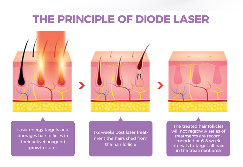The hair follicle melanin is absorbed by the laser of a specific wavelength, and the heat exchange destroys the hair follicle. The laser energy can be injected downward into the hair follicle in the hair follicle, destroying the energy decomposition, causing the hair follicle to stop growing, achieving a permanent hair removal effect, and discharging through the metabolic process without damaging. Blood vessels and nerves. The machine is equipped with 2 TEC condenser to protect the machine for a long service life.